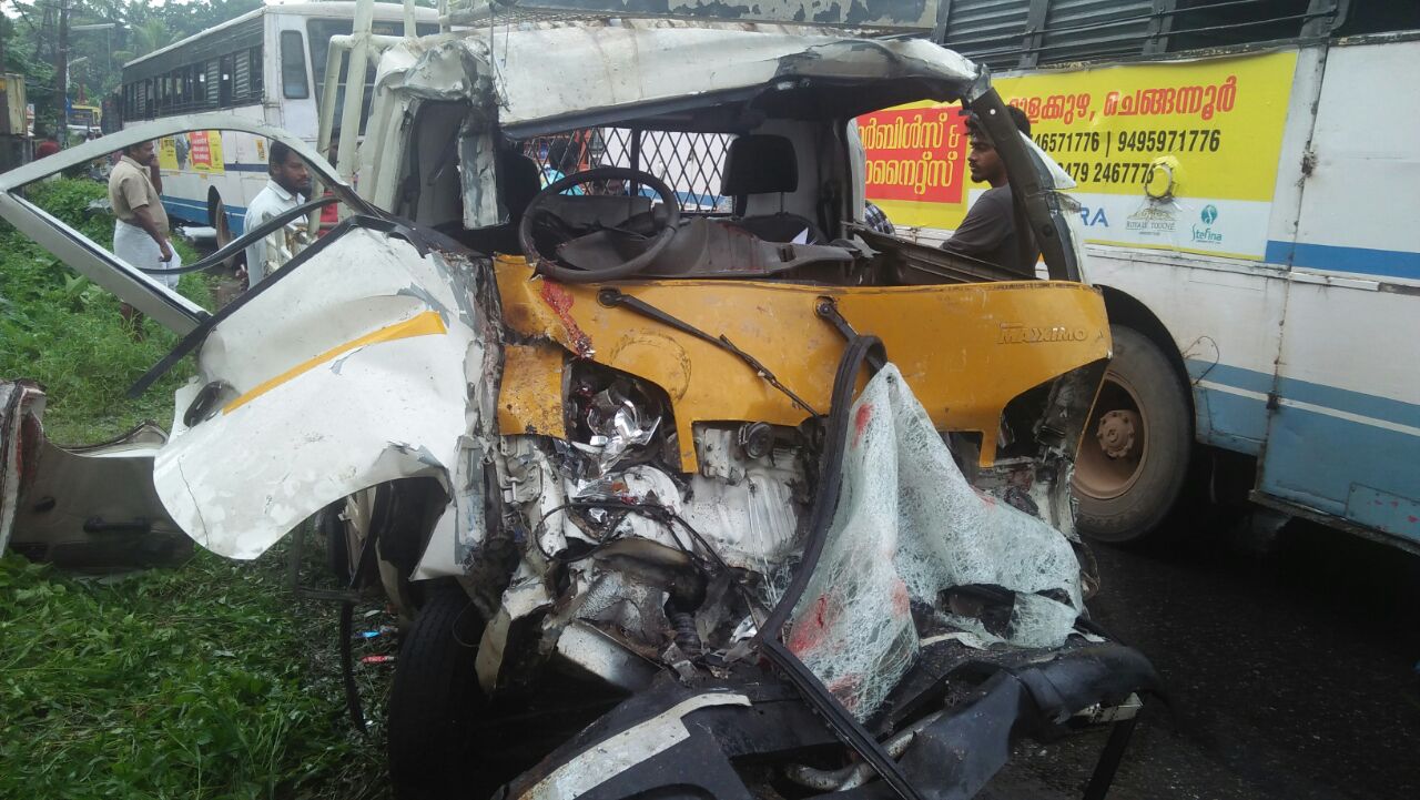ചെങ്ങന്നൂർ മുളക്കുഴയിൽ കെ.എസ് ആർ ടി സി ബസ്സ് ഓട്ടോയിൽ ഇടിച്ച് നാല് പേർ മരിച്ചു. ഗുഡ്സ് ഓട്ടോയിൽ ബസ്സിടിക്കുകയായിരുന്നു. മൂന്ന് പേർ സംഭവസ്ഥലത്ത് വച്ചും ഒരാൾ ആശുപത്രിയിൽ എത്തിയ ശേഷവുമാണ് മരിച്ചത്. രണ്ട് പേരെ തിരിച്ചറിഞ്ഞു.ആലപ്പുഴ സ്വദേശികൾ സജീവ്, ബാബു എന്നിവരാണ് മരിച്ചത്.