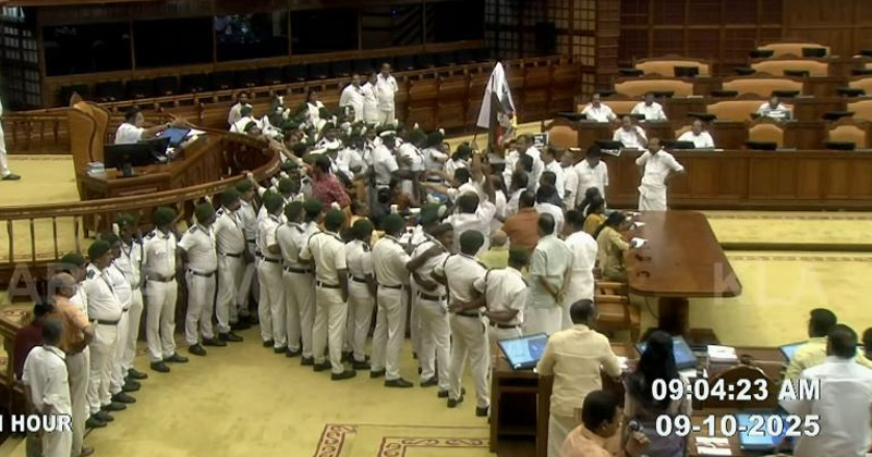 തിരുവനന്തപുരം: ശബരിമലയിലെ സ്വര്ണ്ണപ്പാളി വിവാദത്തില് നിയമസഭയില് പ്രതിപക്ഷം പ്രതിഷേധം ശക്തമാക്കി. തുടര്ച്ചയായ നാലാം ദിവസവും സഭാ നടപടികളെ സ്തംഭിപ്പിച്ച് ഭരണപക്ഷത്തിനെതിരെ പുതിയ ബാനര് ഉയര്ത്തി പ്രതിപക്ഷം നടുത്തളത്തിലിറങ്ങി.
