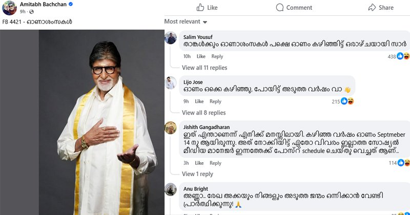 ഓണാശംസകള്‍ വൈകി പങ്കുവെച്ച ബോളിവുഡ് താരം അമിതാഭ് ബച്ചനെ ട്രോളി മലയാളികള്‍. ഓണം കഴിഞ്ഞ് ഒരാഴ്ച പിന്നിട്ട ശേഷമാണ് താരം മുണ്ടും ഷാളുമണിഞ്ഞ ചിത്രം പങ്കുവെച്ചുകൊണ്ട് ആശംസകള്‍ നേര്‍ന്നത്. ഇതോടെ താരത്തിന്റെ പോസ്റ്റിന് താഴെ രസകരമായ കമന്റുകള്‍ നിറഞ്ഞു.