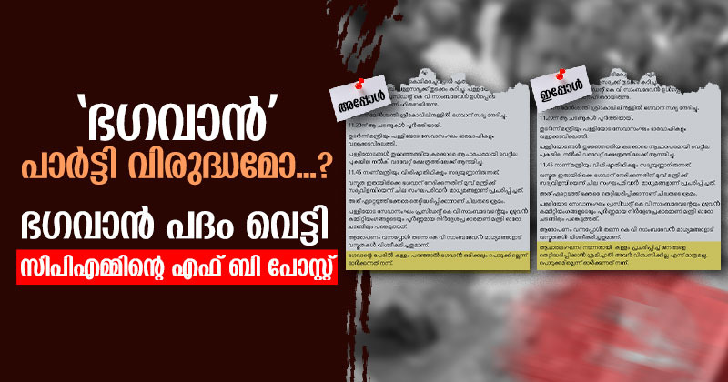ഈശ്വരനാമത്തില്‍ സത്യപ്രതിജ്ഞ ചെയ്ത എംഎല്‍എമാരായ ഐഷ പോറ്റി, എം.എം. മോനായി എന്നിവരെ പിണറായി വിജയന്‍ പാര്‍ട്ടി സെക്രട്ടറിയായിരിക്കെ സംസ്ഥാന കമ്മിറ്റി ശാസിക്കുകയും ചെയ്തു. ഒപ്പം ഗൃഹപ്രവേശത്തിന് ഗണപതി ഹോമം നടത്തിയ സാധാരണ പ്രവര്‍ത്തകര്‍ക്കെതിരെ പോലും പാര്‍ട്ടി ശാസനയും നടപടിയുമായി രംഗത്ത് എത്തിയിരുന്നു. ആറന്മുള പാര്‍ത്ഥസാരഥി ക്ഷേത്രത്തിലെ വള്ളസദ്യ, ദേവന് നിവേദിക്കുന്നതിന് മുന്‍പ് മന്ത്രി വി.എന്‍. വാസവനും മറ്റ് അതിഥികള്‍ക്കും വിളമ്പിയത് വിവാദമായിരുന്നു. ഈ വിവാദം തണുപ്പിക്കാനാണ് രാഷ്ട്രീയ പ്രതിരോധത്തിന് ദൈവികതയെ ആശ്രയിക്കുന്ന പോസ്റ്റുമായി സിപിഎം ജില്ല കമ്മിറ്റിയെത്തിയത്. എന്നാല്‍ ദൈവികത വേണ്ടെന്നും വിശ്വാസ ആചാരങ്ങളുമായി ബന്ധപ്പെട്ട സിപിഎം ആശയം മതിയെന്നും സിപിഎം നേതൃത്വം തന്നെ ആവശ്യപ്പെട്ടതോടെയാണ് ജില്ല കമ്മിറ്റിക്ക് എഫ് ബി പോസ്റ്റില്‍ ഭഗവാനെ വെട്ടേണ്ടി വന്നത്.