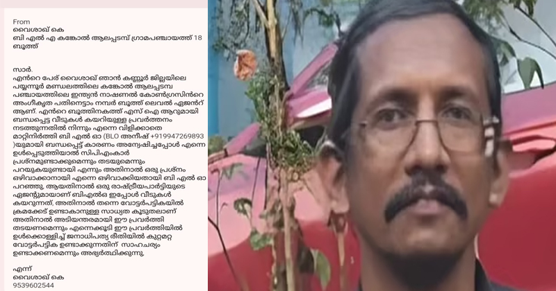 കോണ്ഗ്രസുകാരനായ ബിഎല്എയെ ഉള്പ്പെടുത്തി എസ്ഐആര് ജോലി ചെയ്താല് സിപിഎമ്മുകാര് തടയുമെന്നും പ്രശ്നമുണ്ടാക്കുമെന്നും അനീഷ് ജോര്ജ് ഭയപ്പെട്ടുവെന്നാണ് ബി എല്എയുടെ പരാതിയിലുള്ളത്.