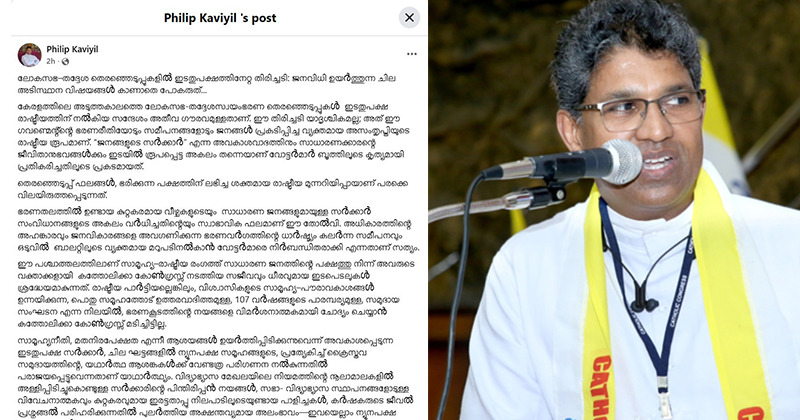 അധികാരത്തിന്റെ ആത്മവിശ്വാസം അഹങ്കാരമായി പരിണമിച്ചു എന്നും, തങ്ങളെ സമീപിച്ച നിവേദനങ്ങളെയും ക്രിയാത്മകമായ വിമര്ശനങ്ങളെയും സര്ക്കാര് ശത്രുതയോടെയാണ് കണ്ടതെന്നും ഫാദര് ഫിലിപ് കവിയില് വിമര്ശിച്ചു. ന്യൂനപക്ഷ സമുദായത്തിന് ഭരണത്തോടുണ്ടായിരുന്ന അസംതൃപ്തി ഈ തിരഞ്ഞെടുപ്പില് പ്രകടമായി. എയ്ഡഡ് സ്കൂളുകളിലെ ഭിന്നശേഷി നിയമനവുമായി ബന്ധപ്പെട്ട വിഷയത്തില് പ്രശ്നം പരിഹരിക്കാന് സര്ക്കാര് ശ്രമിക്കാതിരുന്നത് വലിയ തിരിച്ചടിക്ക് കാരണമായി. ഇത്തരം വിഷയങ്ങളിലെ സര്ക്കാര് നിലപാടാണ് തോല്വിക്ക് വഴിവെച്ചതെന്ന് അദ്ദേഹം സൂചിപ്പിച്ചു. കൂടാതെ, നിലവിലെ പ്രതിപക്ഷത്തിന് ഭാവിയില് ഭരണപക്ഷത്തേക്ക് വരാനുള്ള സാധ്യത അപ്രാപ്യമായിരിക്കില്ലെന്നും അദ്ദേഹം കൂട്ടിച്ചേര്ത്തു.