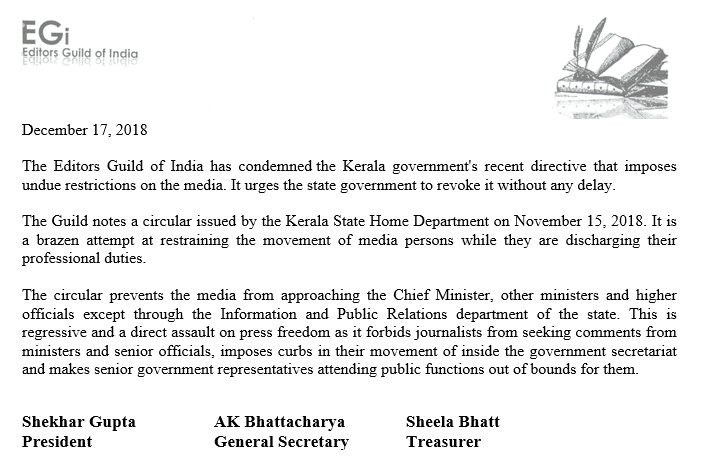 മന്ത്രിമാരില്നിന്നും രാഷ്ട്രീയപ്രവര്ത്തകരില്നിന്നും വാര്ത്തകള് സംബന്ധിച്ച വിവരം തേടുന്നതിനെ വിലക്കുന്നതാണ് സര്ക്കാര് പുറത്തിറക്കിയ സര്ക്കുലര്. മാധ്യമപ്രവര്ത്തകരുടെ ജോലി തടസപ്പെടുത്തുന്നതാണ് സര്ക്കാരിന്റെ ഉത്തരവെന്ന് എഡിറ്റേഴ്സ് ഗില്ഡ് പുറത്തിറക്കിയ പത്രകുറിപ്പില് പറയുന്നു. ഇത് പത്രസ്വാതന്ത്ര്യത്തിനെതിരാണെന്നും അവര് വ്യക്തമാക്കുന്നു.