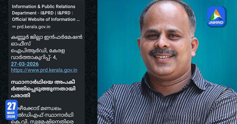 കണ്ണൂര്: അഴീക്കോട് നിയമസഭാ മണ്ഡലം എല്.ഡി.എഫ് സ്ഥാനാര്ത്ഥി കെ.വി. സുമേഷിന് അനുകൂലമായി ജില്ലാ ഇന്ഫര്മേഷന് ഓഫീസ് പ്രസ് റിലീസ് ഇറക്കിയതായി റിപ്പോര്ട്ട്. സര്ക്കാര് സംവിധാനമായ പി.ആര്.ഡി വഴി സ്ഥാനാര്ത്ഥിയുടെ പരാതി സംബന്ധിച്ച വാര്ത്ത നല്കിയത് തിരഞ്ഞെടുപ്പ് പെരുമാറ്റച്ചട്ടത്തിന്റെ ലംഘനമാണെന്ന ആരോപണം ഉയര്ന്നു കഴിഞ്ഞു.