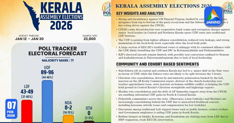 സമുദായങ്ങള്ക്കിടയിലെ വലിയ വോട്ട് മാറ്റവും യുഡിഎഫിന് അനുകൂലമാണ്. മധ്യ-തെക്കന് കേരളത്തിലെ നായര് വോട്ടുകള് വലിയ തോതില് യുഡിഎഫിലേക്ക് മാറാന് സാധ്യതയുണ്ട്. ക്രൈസ്തവ മേഖലകളില് ജെ.ബി കോശി കമ്മീഷന് റിപ്പോര്ട്ടിലെ മെല്ലെപ്പോക്ക്, വന്യജീവി ആക്രമണങ്ങള് തുടങ്ങിയവ യുഡിഎഫിന് ഗുണകരമാകും. സമസ്തയുടെ പിന്തുണ സി.പി.എമ്മില് നിന്ന് മാറുന്നതും മത്സ്യത്തൊഴിലാളികള്, നെല്-റബ്ബര് കര്ഷകര്, സര്ക്കാര് ജീവനക്കാര് എന്നിവര്ക്കിടയിലെ അതൃപ്തിയും ഭരണമാറ്റത്തിന് ആക്കം കൂട്ടുന്ന പ്രധാന ഘടകങ്ങളാണെന്ന് ‘പോള് ട്രാക്കര്’ വിലയിരുത്തുന്നു.