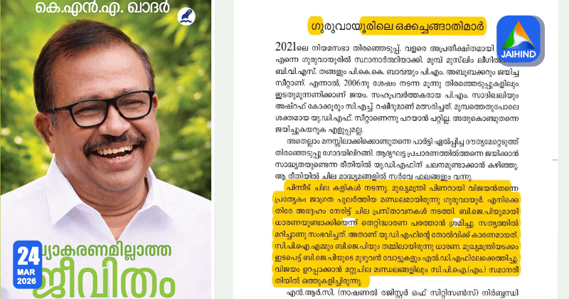 പുസ്തകത്തിലെ ‘ഗുരുവായൂരിലെ ഒക്കച്ചങ്ങാതിമാര്’ എന്ന അധ്യായത്തിലാണ് അന്ന് ഗുരുവായൂരിലെ യുഡിഎഫ് സ്ഥാനാര്ത്ഥിയായിരുന്ന ഖാദര് ആഞ്ഞടിക്കുന്നത്. ബിജെപി സ്ഥാനാര്ത്ഥിയുടെ പത്രിക തള്ളിയത് കൃത്യമായ ഒരു പ്ലാനിന്റെ ഭാഗമായിരുന്നെന്നും ഇത് സിപിഎമ്മുമായുള്ള ധാരണയുടെ അടിസ്ഥാനത്തിലാണെന്നും പുസ്തകം വ്യക്തമാക്കുന്നു. പുസ്തകത്തിന്റെ പ്രസക്തമായ ഭാഗങ്ങള് ജയ്ഹിന്ദ് ന്യൂസിന് ലഭ്യമായിട്ടുണ്ട്.