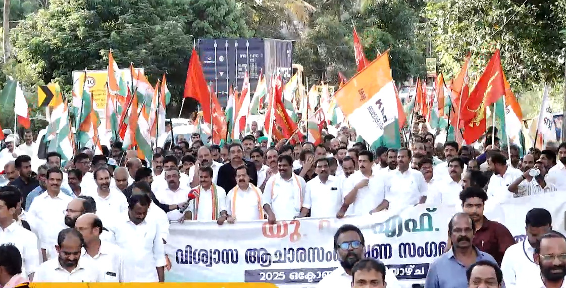 ശബരിമലയിലെ സ്വര്ണക്കൊള്ളയ്ക്കും വിശ്വാസവഞ്ചനയ്ക്കുമെതിരെ വിശ്വാസികള് ഒന്നിക്കുന്ന വിശ്വാസ സംരക്്ഷണ യാത്രയ്ക്ക് ആവേശകരമായ സമാപനം. കെപിസിസിയുടെ നേതൃത്വത്തില് സംസ്ഥാനത്തു പര്യടനം പൂര്ത്തിയാക്കി ചെങ്ങന്നൂരില് സംഗമിച്ച യാത്ര ഇന്ന് കാരയ്ക്കാടു നിന്ന് പദയാത്രയായി അയ്യന്റെ ജന്മദേശമായ പന്തളത്തേയ്ക്കാണ് പദയാത്രയായി പുരോഗമിക്കുന്നത്. ആയിരക്കണക്കിനു വിശ്വാസികളാണ് വിശ്വാസസംഗമത്തിലേയ്ക്ക് ഒഴുകി എത്തിയിരിക്കുന്നത്.