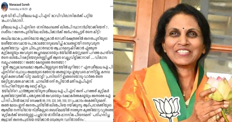 മുന് ഡിജിപി ശ്രീലേഖയെ ശാസ്തമംഗലത്ത് സ്ഥാനാര്ത്ഥിയാക്കിക്കൊണ്ട് ബിജെപി തിരുവനന്തപുരം നഗരസഭ മേയര് സ്ഥാനത്തേക്ക് കൂടി ഉയര്ത്തിക്കാട്ടിയതോടെയാണ് ശ്രീലേഖ ഐ പി എസ് ‘കാവി’വിശ്വാസികള്ക്ക് പറ്റിയ ‘കപട’വിശ്വാസി എന്ന തലക്കെട്ടില് ഫേസ്ബുക്ക് പോസ്റ്റുമായി കെ പി സി സി ജനറല് സെക്രട്ടറി മണക്കാട് സുരേഷ് രംഗത്തെത്തിയത്. പ്രശസ്തമായ ആറ്റുകാല് ക്ഷേത്രത്തിലെ പൊങ്കാലയോടനുബന്ധിച്ച് ചിരപുരാതന ആചാരമായ കുത്തിയോട്ടമനുഷ്ഠിക്കുവാന് എത്തുന്ന കുട്ടികളെയും അവരുടെ രക്ഷിതാക്കളെയും ജയിലില് കയറ്റുമെന്ന നിലപാട് മുന്പ് ശ്രീലേഖ സ്വീകരിച്ചിരുന്നു. സ്ത്രീകളുടെ ശബരിമല എന്നറിയപ്പെടുന്ന ആറ്റുകാല് ക്ഷേത്രത്തിലെ കുത്തിയോട്ട വൃതത്തെ ‘കുട്ടികള്ക്ക് നേരെയുള്ള പച്ചയായ ശാരീരിക മാനസിക പീഡനമെന്ന് വ്യാഖ്യാനിച്ചായിരുന്നു ശ്രീലേഖ പരിഹസിച്ചിരുന്നത്.
