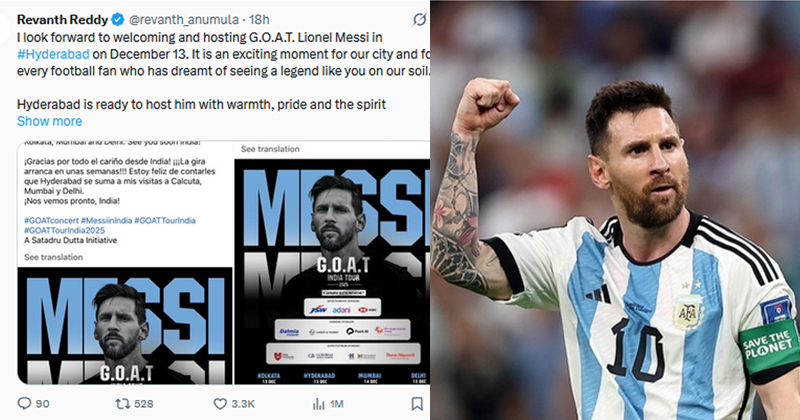 ഹൈദരാബാദ് സന്ദര്‍ശനം മെസിയും ഇന്‍സ്റ്റാഗ്രാമിലൂടെ സ്ഥിരീകരിച്ചു. ‘ഇന്ത്യയുടെ സ്‌നേഹത്തിന് നന്ദി! കൊല്‍ക്കത്ത, മുംബൈ, ഡല്‍ഹി എന്നിവയ്‌ക്കൊപ്പം ഹൈദരാബാദിനെയും ഉള്‍പ്പെടുത്തിയിട്ടുണ്ട്. ഉടന്‍ കാണാം, ഇന്ത്യ,’ മെസി കുറിച്ചു. കേരളത്തില്‍ സൗഹൃദ മത്സരം റദ്ദാക്കിയതിനെ തുടര്‍ന്നാണ് ഹൈദരാബാദിനെ ടൂറില്‍ ഉള്‍പ്പെടുത്താന്‍ തീരുമാനിച്ചതെന്നാണ് ദേശീയ മാധ്യമങ്ങള്‍ റിപ്പോര്‍ട്ട് ചെയ്യുന്നത്.