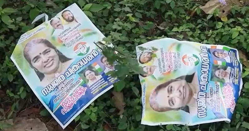 പാലക്കാട് കോണ്ഗ്രസ് സ്ഥാനാര്ത്ഥിയുടെ തിരഞ്ഞെടുപ്പ് പോസ്റ്ററുകള് വ്യാപകമായി നശിപ്പിച്ചതായി പരാതി. തദ്ദേശ തിരഞ്ഞെടുപ്പുമായി ബന്ധപ്പെട്ടാണ് വ്യാപകമായ പ്രചാരണ സാമഗ്രി നശിപ്പിച്ചത്. പട്ടഞ്ചേരി പഞ്ചായത്തിലെ പതിനെട്ടാം വാര്ഡായ കാവില് കളത്താണ് സംഭവം. ഇവിടെ യുഡിഎഫ് സ്ഥാനാര്ത്ഥി സുജിത ചക്രാധരന്റെ തിരഞ്ഞെടുപ്പ് പ്രചാരണ ബോര്ഡുകളും പോസ്റ്ററുകളുമാണ് സാമൂഹ്യ വിരുദ്ധര് വ്യാപകമായി നശിപ്പിച്ച നിലയില് കണ്ടെത്തിയത്.