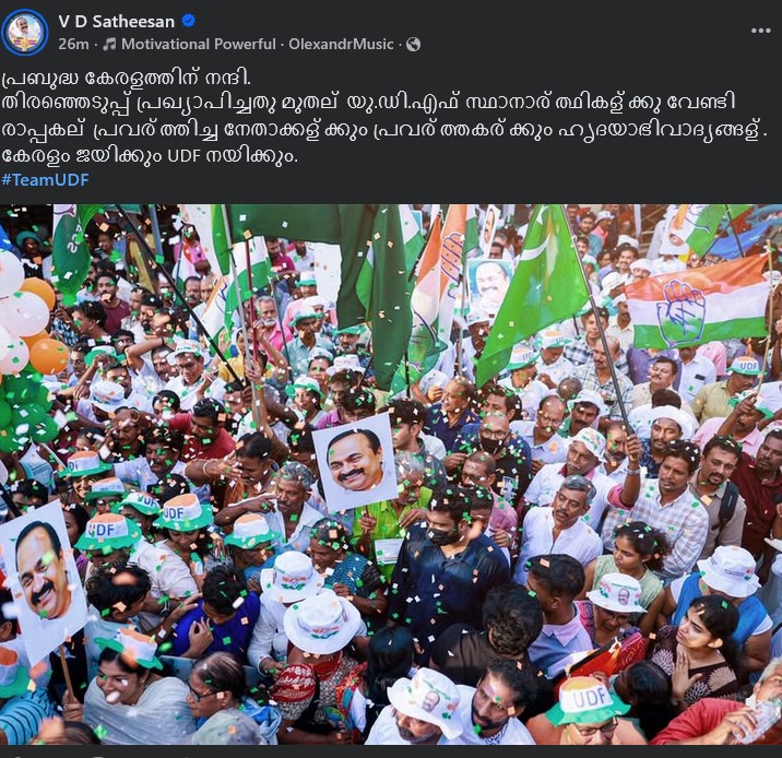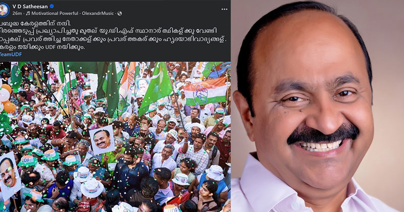 തിരഞ്ഞെടുപ്പ് പ്രഖ്യാപിച്ചത് മുതൽ യുഡിഎഫ് സ്ഥാനാർത്ഥികൾക്കായി രാപ്പകൽ ഭേദമന്യേ അധ്വാനിച്ച നേതാക്കൾക്കും അണികൾക്കും ഹൃദയാഭിവാദ്യങ്ങൾ നേർന്നുകൊണ്ടാണ് പ്രതിപക്ഷ നേതാവിന്റെ സോഷ്യൽ മീഡിയ കുറിപ്പ്. വോട്ടെടുപ്പ് അവസാനിച്ചതോടെ ശുഭപ്രതീക്ഷയിലാണ് മുന്നണിയെന്ന് അദ്ദേഹം വ്യക്തമാക്കി.