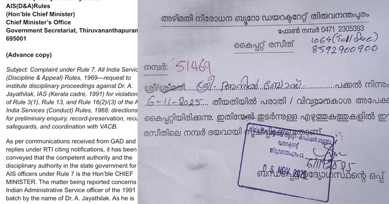 കഴിഞ്ഞ ഒരു വര്ഷത്തിലേറെയായി എന്. പ്രശാന്ത് ഐ.എ.എസ് സസ്പെന്ഷനിലാണ്. നിയമം എല്ലാവര്ക്കും ഒരുപോലെയാണെങ്കില്, ഡോ. ജയതിലകിനെ സസ്പെന്ഡ് ചെയ്തുകൊണ്ടുള്ള ഉത്തരവ് ഏത് നിമിഷവും പ്രതീക്ഷിക്കാമെന്ന് അദ്ദേഹം സോഷ്യല് മീഡിയയില് പ്രതികരിച്ചു. ഭരണഘടനയുടെ അനുച്ഛേദം 14 ഉറപ്പാക്കുന്ന നിയമത്തിന് മുന്നിലെ തുല്യത, ഒരു ജൂനിയര് ഉദ്യോഗസ്ഥന് ഒരു മാനദണ്ഡവും ചീഫ് സെക്രട്ടറിക്ക് മറ്റൊരു മാനദണ്ഡവും സാധ്യമല്ല എന്ന് അടിവരയിടുന്നു. ഡിസിപ്ലിനറി അതോറിറ്റിയായ മുഖ്യമന്ത്രിക്ക് നേരിട്ടാണ് പരാതി നല്കിയിരിക്കുന്നത്. ഡോ. ജയതിലക് കൈകാര്യം ചെയ്യുന്ന ജിഎഡി വകുപ്പില് സ്വയം സസ്പെന്ഡ് ചെയ്യാനുള്ള ഫയല് അദ്ദേഹം സമര്പ്പിക്കാന് സാധ്യതയില്ലെന്നും പ്രശാന്ത് തന്റെ കുറിപ്പില് പറയുന്നു.