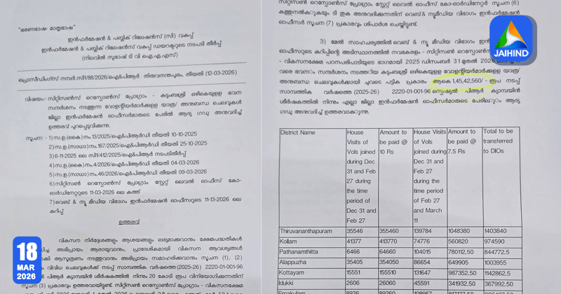 സര്ക്കാരിന്റെ വികസന ലഘുലേഖകള് വിതരണം ചെയ്യുന്ന വോളന്റിയര്മാര്ക്ക് വീടൊന്നിന് നിശ്ചിത തുക വീതം അനുവദിച്ചിട്ടുണ്ട്. ഒരാളാണ് എത്തുന്നതെങ്കില് 7.50 രൂപയും രണ്ടുപേരാണെങ്കില് 10 രൂപയുമാണ് ലഭിക്കുക. ഇടത് സര്വീസ് സംഘടനയായ ഗസറ്റഡ് ഓഫീസേഴ്സ് അസോസിയേഷന് നല്കുന്ന കണക്കുകള്ക്കനുസരിച്ചാണ് ജില്ലാ ഇന്ഫര്മേഷന് ഓഫീസര്മാര് ഈ തുക കൈമാറുന്നത്. ഇത് പാര്ട്ടി പ്രവര്ത്തകര്ക്ക് സര്ക്കാര് ഖജനാവില് നിന്ന് പണം നല്കാനുള്ള കുറുക്കുവഴിയാണെന്നും സാധാരണക്കാരെ നരകത്തിലേക്ക് തള്ളിവിട്ട് പാര്ട്ടി വോളന്റിയര്മാര്ക്ക് ‘നവലോകം’ കെട്ടിപ്പടുക്കാനാണ് സര്ക്കാര് ശ്രമിക്കുന്നതെന്നും റിപ്പോര്ട്ടില് പറയുന്നു.