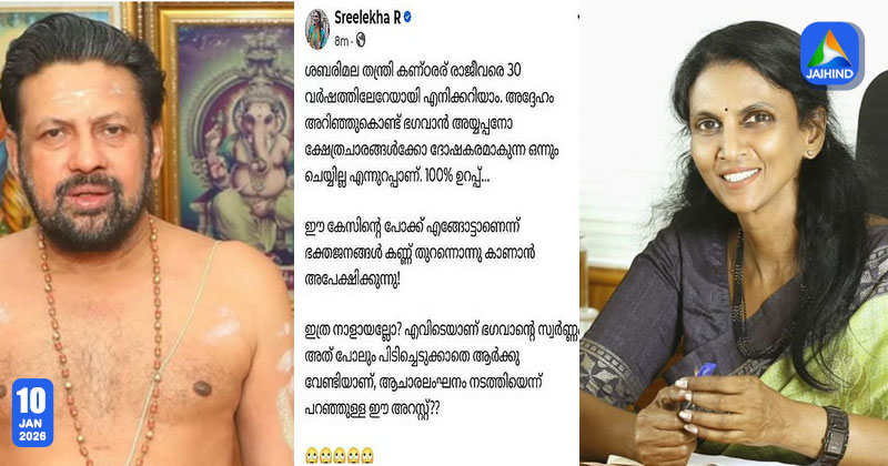 സ്വര്ണ്ണക്കൊള്ളക്കേസില് അറസ്റ്റിലായ തന്ത്രി കണ്ഠരര് രാജീവരെ പിന്തുണച്ച് ആര്. ശ്രീലേഖ. തന്ത്രിയെ തള്ളുന്ന ബിജെപി നിലപാടിന് വിരുദ്ധമായാണ് ശ്രീലേഖ തന്റെ ഫേസ്ബുക്ക് കുറിപ്പിലൂടെ രംഗത്തെത്തിയത്. കണ്ഠരര് രാജീവരരെ തനിക്ക് മുപ്പത് വര്ഷത്തിലേറെയായി അടുത്തറിയാമെന്നും, അയ്യപ്പസ്വാമിക്ക് ദോഷകരമാകുന്ന യാതൊന്നും അദ്ദേഹം ബോധപൂര്വ്വം ചെയ്യില്ലെന്നും ശ്രീലേഖ പോസ്റ്റില് കുറിച്ചു. ഈ കേസിന്റെ പോക്ക് എങ്ങോട്ടാണെന്ന് ഭക്തജനങ്ങള് ജാഗ്രതയോടെ കാണണമെന്നും അവര് കുറിപ്പില് അഭ്യര്ത്ഥിച്ചു. എന്നാല് പോസ്റ്റ് വിവാദമായതോടെ പിന്നീട് ഇത് പിന്വലിച്ചു.