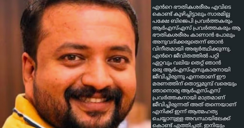 എന്റെ ഭൗതികശരീരം എവിടെ കൊണ്ട് കുഴിച്ചിട്ടാലും ബിജെപി-ആര്എസ്എസ് പ്രവര്ത്തകരെ ആ ശരീരം കാണാന് പോലും അനുവദിക്കരുത്. ഒരു ആര്എസ്എസുകാരനായി ജീവിച്ചുവെന്നതാണ് ജീവിതത്തില് ചെയ്ത ഏറ്റവും വലിയ തെറ്റെന്നും അദ്ദേഹം വാട്സ്ആപ്പ് സന്ദേശത്തില് പറയുന്നു. മരണത്തിനു തൊട്ടുമുമ്പ് വരെയും ആര്എസ്എസുകാരനായിരുന്നു. എന്നെ മരണത്തിലേക്ക് തള്ളിവിട്ടതും അത് തന്നെയാണ്. മണ്ണ് മാഫിയപോലെ നിയമവിരുദ്ധമായ പ്രവര്ത്തനങ്ങള്ക്ക് അധികാരത്തിന്റെ ബലമുണ്ടാവാനാണ് തന്നെ ഒഴിവാക്കിയതെന്നും അദ്ദേഹം ചൂണ്ടികാട്ടി. എന്തായാലും, അധികാരമോഹത്തിന്റെ വെറും എടുത്തുചാട്ടമായിരുന്നു ആനന്ദ് നടത്തിയത് എന്ന് ബിജെപി ന്യായീകരിച്ചാലും സന്ദേശത്തില് ചൂണ്ടികാട്ടുന്ന വിവിധ ആരോപണങ്ങളില് നേതൃത്വം മറുപടി പറഞ്ഞേ തീരൂ.