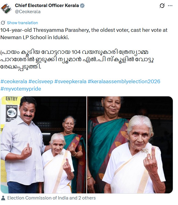 ജനാധിപത്യം എന്നാൽ വെറും വാഗ്ദാനങ്ങളല്ല, അത് പൗരന്റെ കടമ കൂടിയാണെന്ന് ഓർമ്മിപ്പിക്കുകയാണ് 104 വയസ്സുകാരിയായ ത്രേസ്യാമ്മ പാറശേരി. സംസ്ഥാനത്തെ തന്നെ ഏറ്റവും പ്രായം കൂടിയ വോട്ടറായ ഇവർ, ഇടുക്കി ന്യൂമാൻ എൽപി സ്കൂളിലെ ബൂത്തിലെത്തി തന്റെ വോട്ട് രേഖപ്പെടുത്തി. പുതിയ തലമുറയ്ക്ക് മാതൃകയാവുന്ന ഈ നിശ്ചയദാർഢ്യം തന്നെയാണ് നമ്മുടെ ജനാധിപത്യത്തിന്റെ കരുത്ത്.