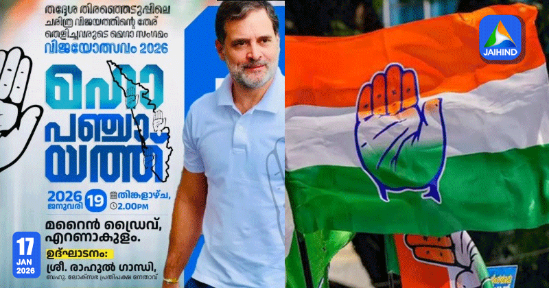 കൊച്ചി: തദ്ദേശ തിരഞ്ഞെടുപ്പില്‍ യുഡിഎഫ് നേടിയ ചരിത്ര വിജയം ആഘോഷിക്കാന്‍ എറണാകുളം ഒരുങ്ങി. തിരഞ്ഞെടുപ്പ് വിജയത്തിന്റെ തേര് തെളിച്ച ജനപ്രതിനിധികളുടെയും പ്രവര്‍ത്തകരുടെയും മെഗാ സംഗമമായ ‘വിജയോത്സവം 2026 – മഹാപഞ്ചായത്ത്’ തിങ്കളാഴ്ച എറണാകുളത്ത് നടക്കും. വിജയാഘോഷങ്ങള്‍ക്ക് ആവേശം പകരാന്‍ രാഹുല്‍ ഗാന്ധി തിങ്കളാഴ്ച കൊച്ചിയിലെത്തും. സമ്മേളനത്തിനായുള്ള ഒരുക്കങ്ങളെല്ലാം പൂര്‍ത്തിയായതായി സംഘാടകര്‍ അറിയിച്ചു. ജില്ലയിലെ മുതിര്‍ന്ന നേതാക്കള്‍ വേദിയിലെത്തി ക്രമീകരണങ്ങള്‍ വിലയിരുത്തി.