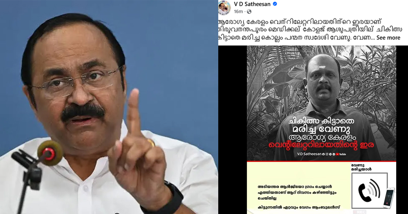ആരോഗ്യ കേരളം വെന്റിലേറ്ററിലായതിന്റെ ഇരയാണ് തിരുവനന്തപുരം മെഡിക്കല്‍ കോളജ് ആശുപത്രിയില്‍ ചികിത്സ കിട്ടാതെ മരിച്ച കൊല്ലം പന്മന സ്വദേശി വേണുവെന്ന് പ്രതിപക്ഷ നേതാവ് വി ഡി സതീശന്‍. വേണു മരിച്ചതല്ലെന്നും ഒന്‍പതര വര്‍ഷം കൊണ്ട് ഈ സര്‍ക്കാര്‍ തകര്‍ത്തു തരിപ്പണമാക്കിയ ആരോഗ്യവകുപ്പും കുത്തഴിഞ്ഞ സംവിധാനങ്ങളും ചേര്‍ന്ന് കൊലപ്പെടുത്തിയതാണെന്നും അദ്ദേഹം ആരോപിച്ചു. സിസ്റ്റം തകര്‍ത്ത ആരോഗ്യമന്ത്രിക്കും സര്‍ക്കാരിനും വേണുവിന്റെ മരണത്തിന്റെ ഉത്തരവാദിത്തത്തില്‍ നിന്നും ഒഴിഞ്ഞു മാറാനാകില്ലെന്നും അദ്ദേഹം കൂട്ടിച്ചേര്‍ത്തു.
