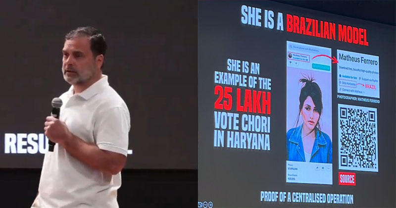 പത്രസമ്മേളനത്തിനിടെ, ഹരിയാന നിയമസഭാ തിരഞ്ഞെടുപ്പില് ഒരു ബ്രസീലിയന് മോഡല് സ്ത്രീയുടെ ഫോട്ടോ ഉപയോഗിച്ച് 10 വ്യത്യസ്ത ബൂത്തുകളില് സീമ, സ്വീറ്റി, സരസ്വതി, രശ്മി, വില്മ എന്നിങ്ങനെ വ്യത്യസ്ത പേരുകളില് 22 തവണ വോട്ട് ചെയ്തതായി കോണ്ഗ്രസ് നേതാവ് അവകാശപ്പെട്ടു. ഇത് കേന്ദ്രീകൃതമായി നടന്ന ഓപ്പറേഷന് ആണെന്നും എട്ടു സീറ്റുകളില് 22 മുതല് നാലായിരം വരെ വോട്ടുകളുടെ വ്യത്യാസത്തിലാണ് ഫലം വന്നതെന്നും രാഹുല് പറഞ്ഞു. ഒരു സ്ത്രീ 223 തവണ വരെ വോട്ട് ചെയ്തതായും ഒരേ ഫോട്ടോ ഉപയോഗിച്ചാണ് വോട്ട് ചെയ്തതെന്നും രാഹുല് ചൂണ്ടിക്കാട്ടി.
