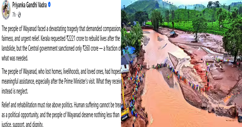 കാരുണ്യം, നീതി, അടിയന്തര സഹായം എന്നിവ ആവശ്യമുള്ള ഒരു വിനാശകരമായ ദുരന്തത്തെയാണ് വയനാട്ടിലെ ജനങ്ങള് നേരിട്ടത്. മണ്ണിടിച്ചിലിന് ശേഷം ജീവിതം പുനര്നിര്മ്മിക്കാന് കേരളം 2221 കോടി രൂപ ആവശ്യപ്പെട്ടു, എന്നാല് കേന്ദ്ര സര്ക്കാര് അനുവദിച്ചത് 260 കോടി രൂപ മാത്രമാണ്. ആവശ്യമായതിന്റെ ഒരു ചെറിയ ഭാഗം മാത്രമാണിത്. പ്രധാനമന്ത്രിയുടെ സന്ദര്ശനത്തിനുശേഷം വീടുകളും ഉപജീവനമാര്ഗങ്ങളും പ്രിയപ്പെട്ടവരും നഷ്ടപ്പെട്ട വയനാട്ടിലെ ജനങ്ങള് നീതിപൂര്വമായ സഹായം പ്രതീക്ഷിച്ചിരുന്നു. എന്നാല് പകരം അവര്ക്ക് ലഭിച്ചത് അവഗണനയാണെന്നും പ്രിയങ്ക പറഞ്ഞു.